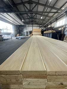 Кроме того, собственное производство позволяет производить эксклюзивные товары, например, комбинация террасной и палубной доски - эксклюзивная доска Дуэт. Для наших покупателей мы оказываем услуги распиловки и антисептирования погружным методом (окунанием). Наиболее популярные модели и размеры есть в наличии на нашем складе, кроме того мы производим пиломатериалы под заказ по индивидуальным размерам.