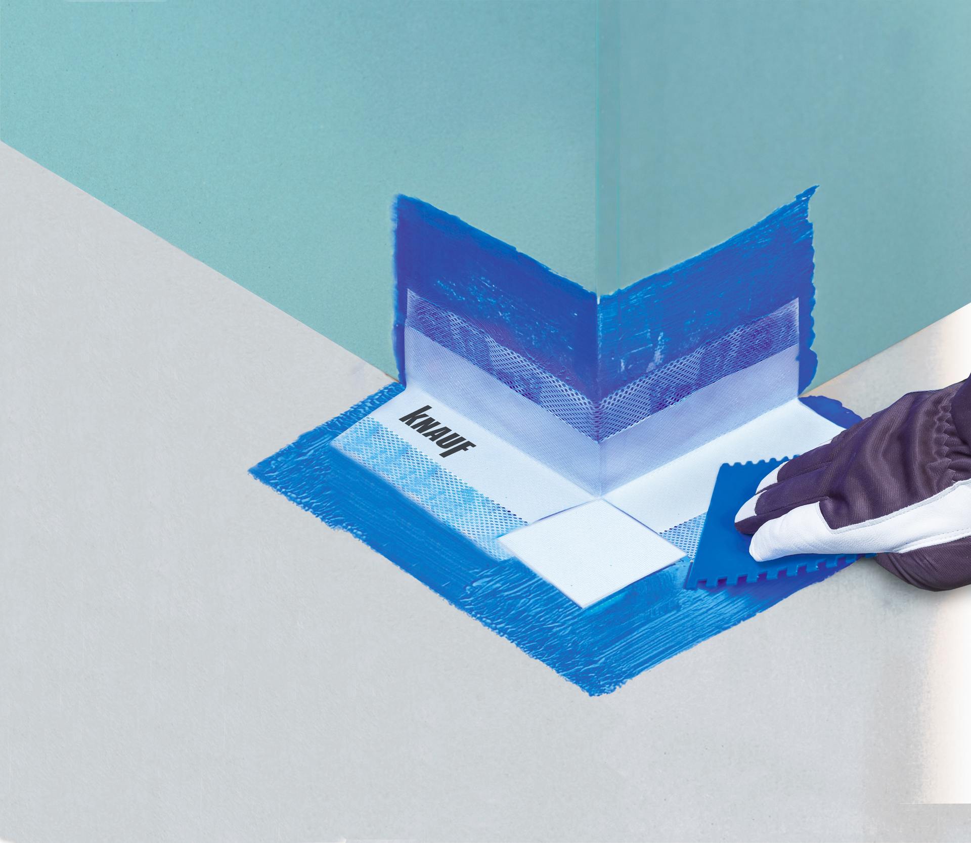 Угол КНАУФ гидроизоляционный внешний представляет собой эластомер, нанесенный на полиэфирную сетку или эластомер, покрытый полиэфирным полотном с двух сторон.