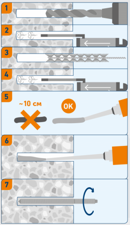 Быстрозастывающая, двухкомпонентная морозостойкая инжекционная масса без стирола на основе винилэстера для использования в холодных зимних условиях. Подходит для монтажа крепления стальных конструкций и арматурных стержней, устанавливаемых в бетонные фасады, ограждений, опорных пластин, работы с пустотелыми и полнотелыми материалами (бетон, керамзит, камень, кирпич). Монтаж можно производить близко к краю и с малыми расстояниями между точками креплений. Можно хранить и использовать при температуре до -20 °C. Условия применения зависят от качества материала шпильки или арматуры: • оцинкованный - для сухих помещений и временных креплений на улице; • горячеоцинкованный/MG и A2 - для сухих и влажных помещений, на улице (только в сельской местности); • A4 - в помещении, на улице и в индустриальной зоне; • HCR - для особо агрессивных условий.