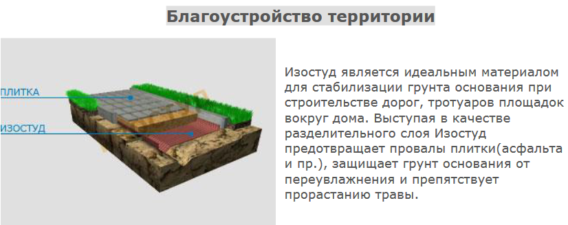 вокруг дома. Выступая в качестве разделительного слоя Изостуд предотвращает провалы плитки(асфальта и пр.), защищает грунт основания от переувлажнения и препятствует прорастанию травы