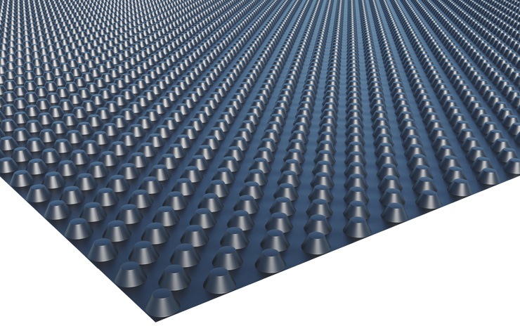 Изостуд – это многофункциональная профилированная мембрана из полиэтилена высокой плотности с равномерно размещенными по всей площади выступами в форме усеченных конусов высотой 8 мм.