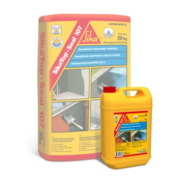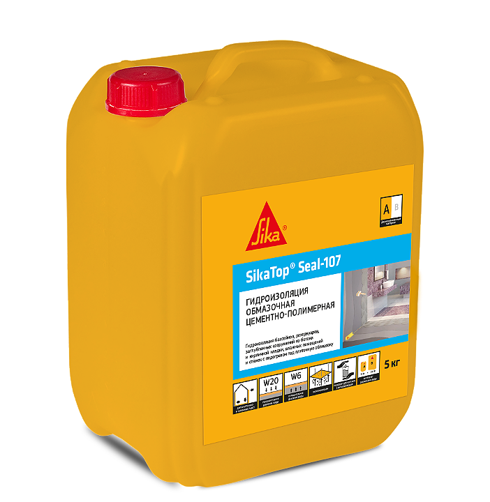 Гидроизоляция универсальная цементно-полимерная Sika TopSeal-107 - двухкомпонентная цементно-полимерная обмазочная гидроизоляция на минеральной основе, состоящая из жидкого полимера и сухой смеси на основе цемента со специальными добавками. Применяется для внутренней и наружной гидроизоляции бассейнов, ванных, душевых, кухонь, балконов, террас, фундаментов, подвалов и т.п. Держит отрицательное давление воды. Перекрывает трещины. Допускается к контакту с питьевой водой. Можно покрывать красками и приклеивать плитку. Не вызывает коррозии. Повышает стойкость бетона к морозу.