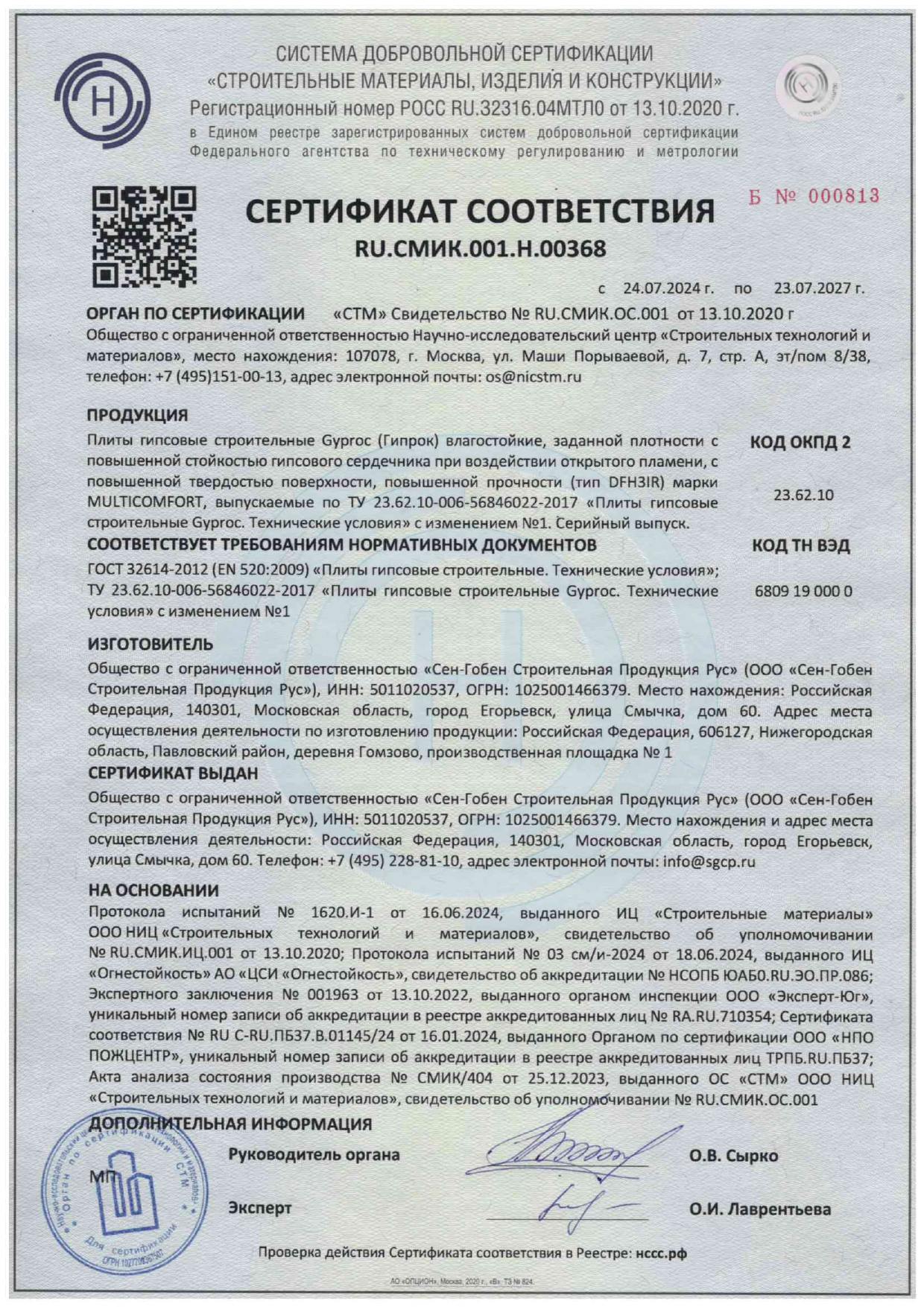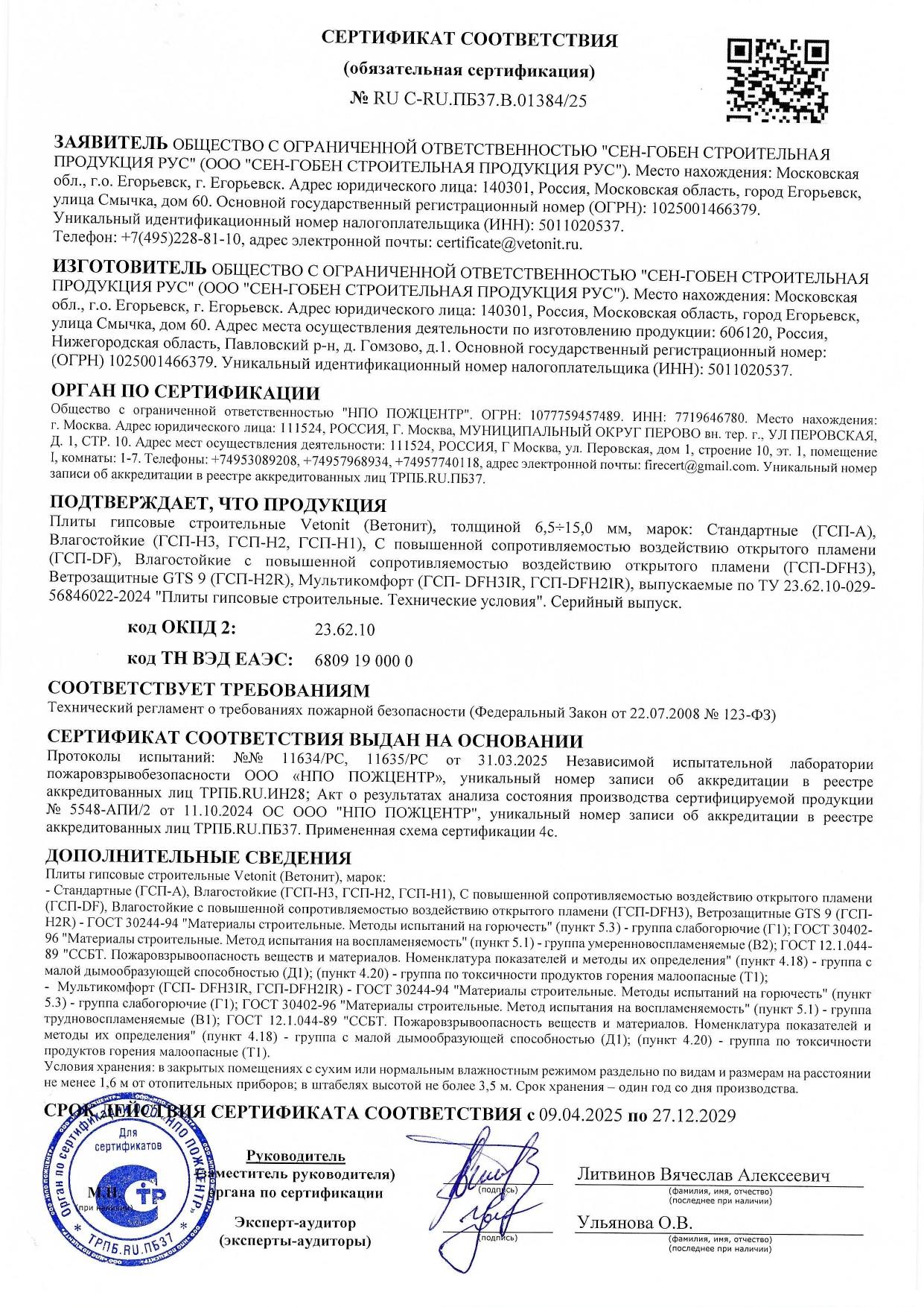 | Воспламеняемость: | В2 (В1 при использовании шпаклевки Гипрок Фаст-60 толщиной от 0.5мм) |