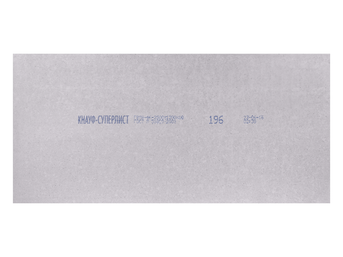 Гипсоволокнистый лист влагостойкий КНАУФ ГВЛВ 10 х 1200 х 2500 мм ФК -КНАУФ-суперлист - высококачественная экологически чистая разновидность гипсоволокнистых листов. Предназначен для строительных отделочных работ сухим способом. Производится ООО "КНАУФ ГИПС Дзержинск" и ОАО "КНАУФ ГИПС Челябинск" по ГОСТ Р 51829-2001 прессованием смеси гипсового вяжущего и волокон распушенной макулатуры, равномерно распределенных по всему объему листа.