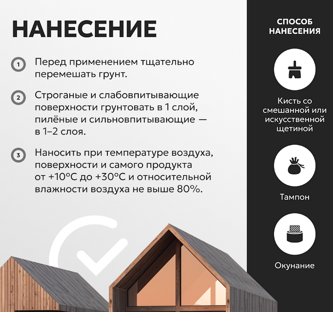 Строганые и слабовпитывающие поверхности грунтовать в 1 слой, пиленые и сильновпитывающие – в 1-2 слоя. Наносить при температуре воздуха, поверхности и самого продукта от +10°С до +30°С и относительной влажности воздуха не выше 80%.
