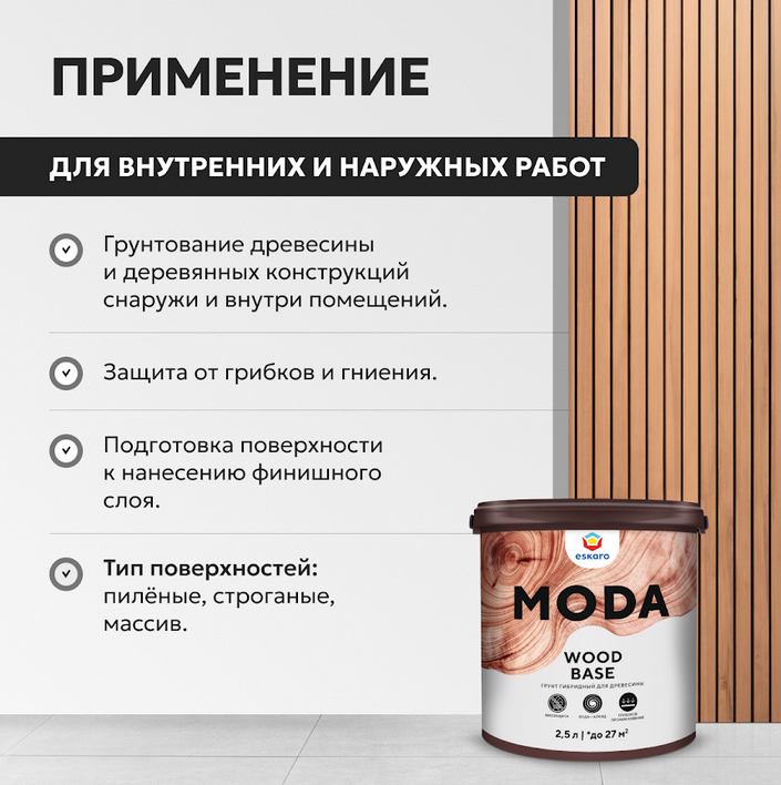 Moda Wood Base — гибридный грунт для древесины с высокой проникающей способностью, обеспечивающий надежную биозащиту и долговечность лакокрасочных покрытий. Благодаря алкидно-акриловой формуле материал глубоко проникает в структуру древесины, эффективно защищает от гниения, плесени, грибка, водорослей и других биологических поражений, регулирует влажность и повышает устойчивость к внешним воздействиям.