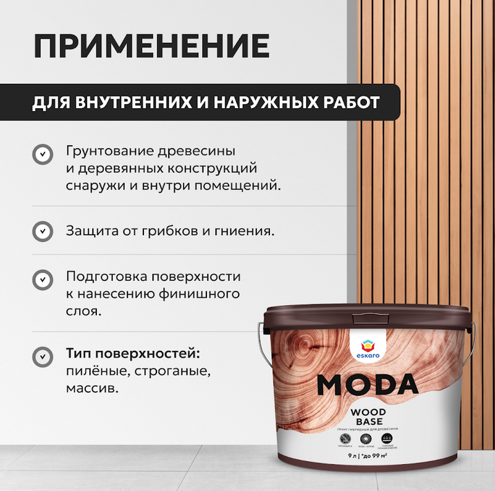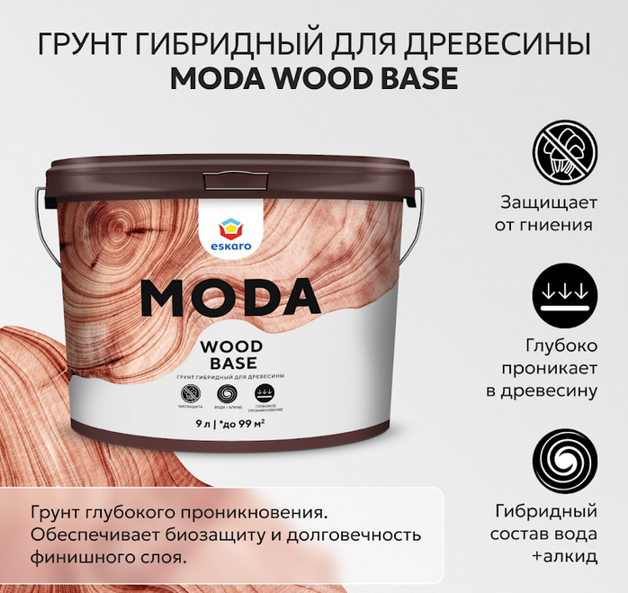 Moda Wood Base — гибридный грунт для древесины с высокой проникающей способностью, обеспечивающий надежную биозащиту и долговечность лакокрасочных покрытий. Благодаря алкидно-акриловой формуле материал глубоко проникает в структуру древесины, эффективно защищает от гниения, плесени, грибка, водорослей и других биологических поражений, регулирует влажность и повышает устойчивость к внешним воздействиям.