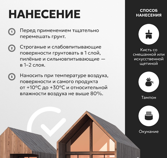 Строганые и слабовпитывающие поверхности грунтовать в 1 слой, пиленые и сильновпитывающие – в 1-2 слоя. Наносить при температуре воздуха, поверхности и самого продукта от +10°С до +30°С и относительной влажности воздуха не выше 80%.