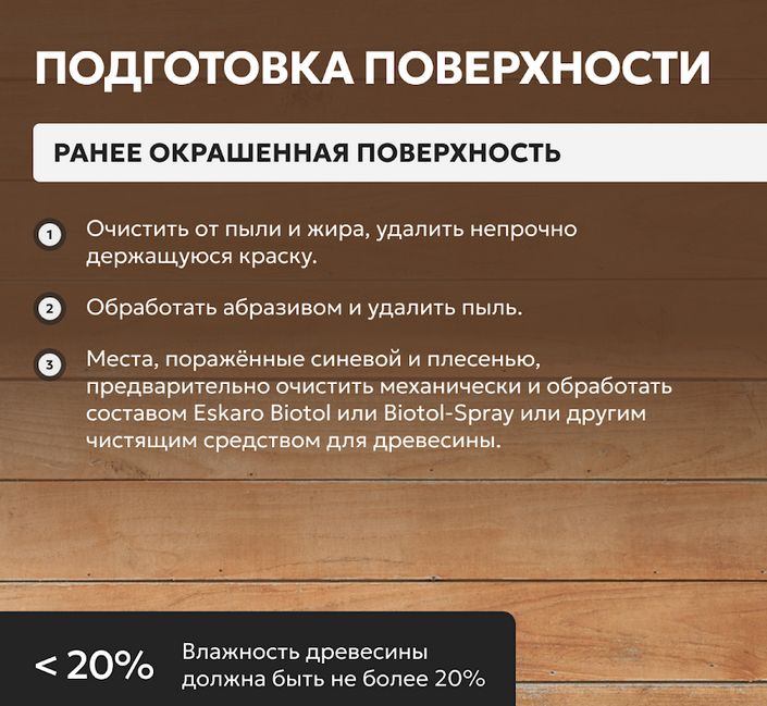 Новую поверхность тщательно очистить от пыли, жира и смол. Произвести шлифовку необработанной поверхности бумагой, шлиф блоком или шлиф диском размером зерна P120 (P180 по высокого качества строганой поверхности) и удалить пыль.