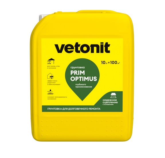 Ветонит Prim Optimus 10л – грунтовка глубокого проникновения для качественной подготовки стен, потолков и полов под последующее оштукатуривание, шпаклевание, окрашивание, оклейку обоями, приклеивание плитки, нанесение полимерной гидроизоляции, ровнителей и наливных полов. Для подготовки оснований при устройстве фасадных систем теплоизоляции Vetonit, перед нанесением минеральных декоративных штукатурок и окраской акриловыми, силиконовыми и силикатными красками. Укрепляет поверхность, связывает пыль и снижает впитывающую способность основания. Для наружных и внутренних работ.