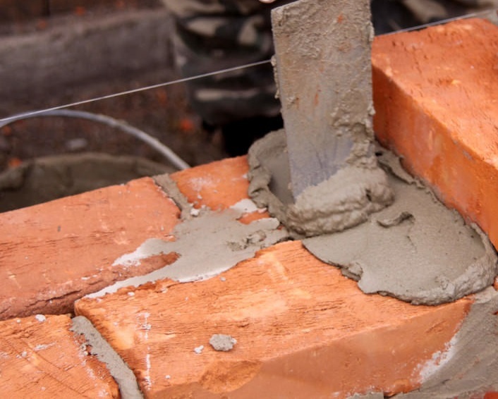 Перед укладкой первого ряда поверхность необходимо выровнять растворной смесью и равномерно нанести растворную смесь на контактные грани кирпича, уложить первый ряд. Готовую растворную смесь с помощью кельмы равномерно нанести на горизонтальную и вертикальную поверхности кладки, в случае кладки керамических блоков только на горизонтальную поверхность.