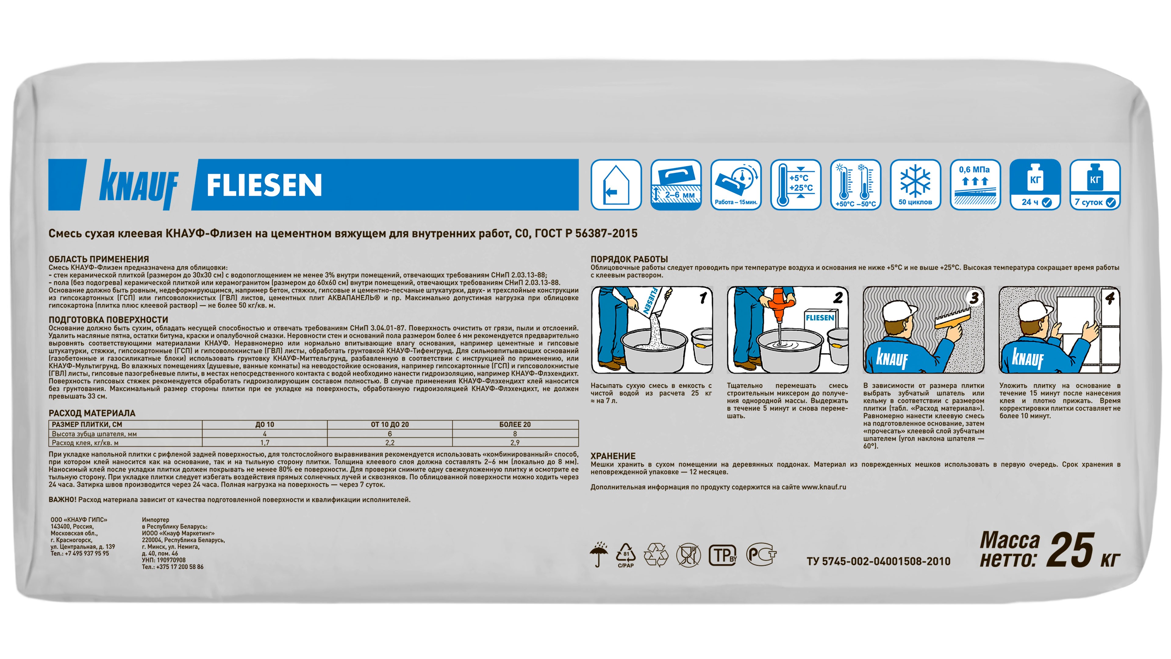 Клей КНАУФ Флизен для плитки - используется для наружных и внутренних работ. Для тонкослойного приклеивания впитывающих влагу керамических плиток, с водопоглощением не менее 3% по массе. Водопоглощение керамических плиток для наружного применения не должно быть более 5% по массе для стен и 9% для цоколя.