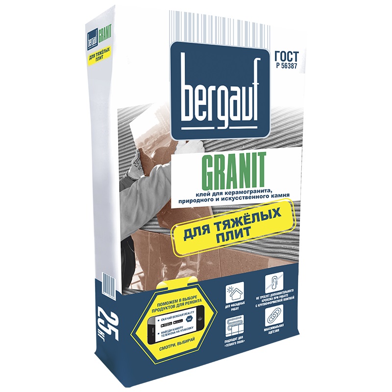 Клей для керамогранита Bergauf Granit на цементной основе. Широко применяется для облицовки пола и стен, в помещениях с повышенной влажностью, для облицовки бассейнов, а также для фасадных работ. Применяется для: керамогранита, крупноформатной плитки, а также природного и искусственного камня. Обеспечивает прочное сцепление с минеральными основаниями (каменными, бетонными и газобетонными, кирпичными, отштукатуренными поверхностями), а также с деформирующимися и критичными основаниями ( ГКЛ, ГВЛ, ЦСП, старая керамическая плитка, ячеистый бетон и железобетон моложе 6 месяцев и тд.) Преимущества: -Не требует дополнительного крепежа при работе с крупноформатной плиткой; -Подходит для оснований ГКЛ, ГВЛ, ЦСП, СМЛ OSB, ДСП; - Не боится влаги и скачков температуры выдерживает диапазон -50 + 70 °С -Подходит для "теплого пола". Цвет: Серый Характеристика применения: Расход сухой смеси на 1 кв.м. при слое 1 мм - от 1,2 кг* Рекомендуемая толщина слоя - 3-20 мм Жизнеспособность готового раствора в открытой таре - 3 часа Время полного набора прочности - 28 суток Затирка швов допускается через - 12ч**(верт.) / 24ч**(гор.) Можно ходить через- 24 часа** Открытое время - 30 мин Стойкость к сползанию - не более 0,5 мм Проведение работ при температуре основания +5 до +30 °С Подготовка оснований: Очистить поверхность от грязи и пыли, отслаивающихся старых покрытий и масляных пятен – всего, что может ухудшить адгезию материала к основанию. В случае необходимости произвести выравнивание поверхности. Для неровностей до 10 мм. Рекомендуется использовать клей Bergauf Granit для заделки локальных неровностей не менее чем за 1 сутки до приклеивания плитки. Для неровностей более 10 мм. Рекомендуется использовать соответствующий материал из линейки Bergauf. Подготовленное основание необходимо обработать грунтовкой в зависимости от типа основания Bergauf Primagrunt, Tiefgrunt, Aqua Grunt, Betonkontakt. Приготовление: Затворить смесь водой (от плюс 5 до плюс 25 градусов) в пропорции:
