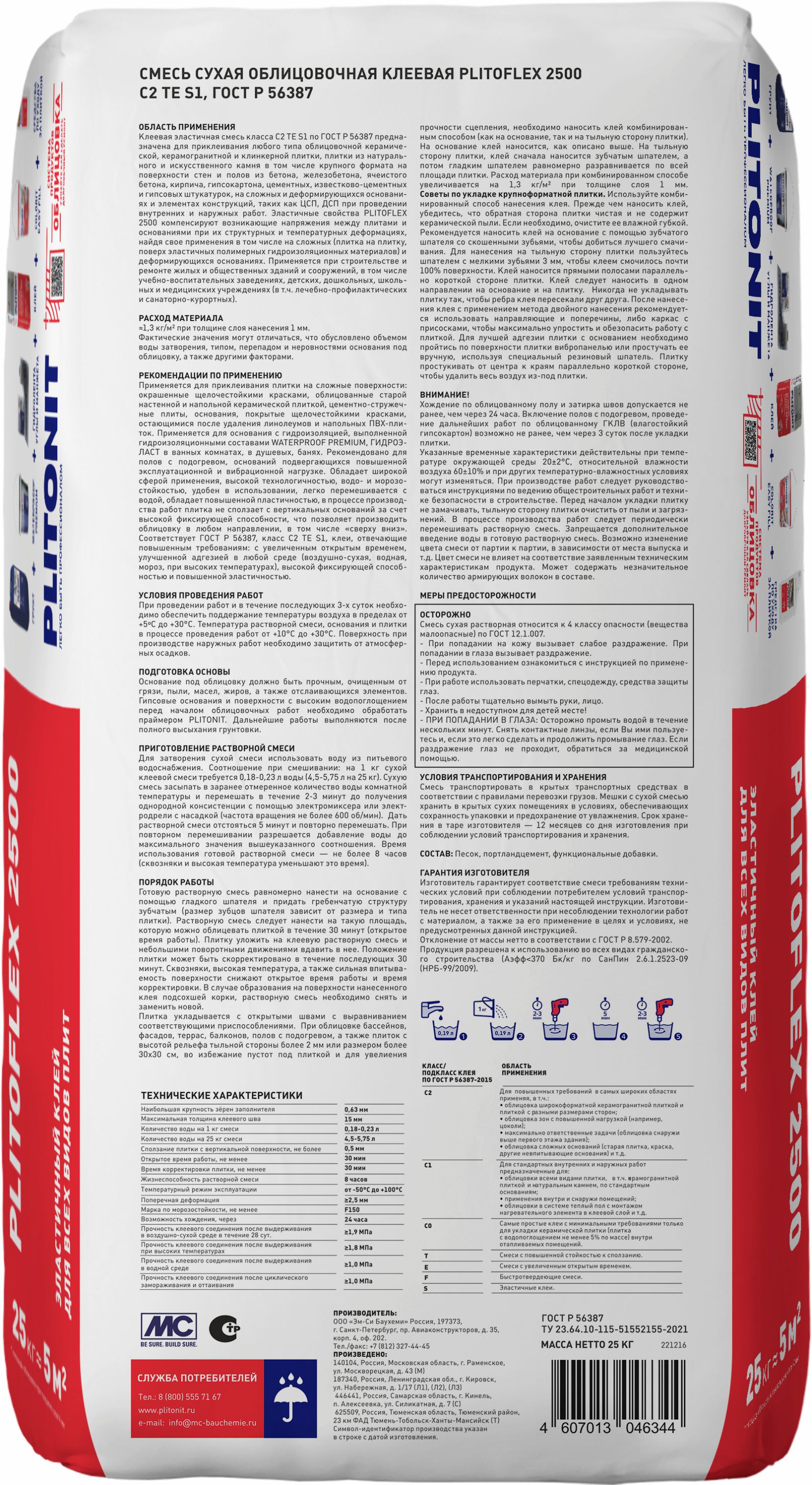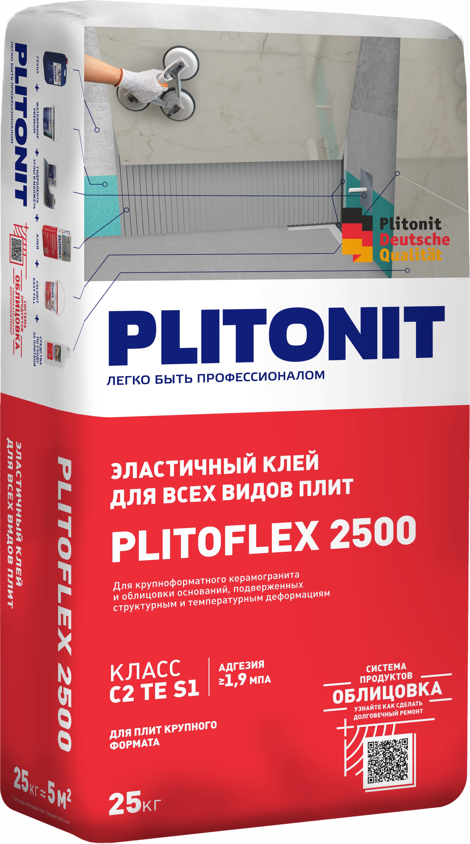 Клей для керамогранита Питонит PLITOFLEX 2500 серый класс C2 TE S1 25кг - эластичный клей для всех видов плит.