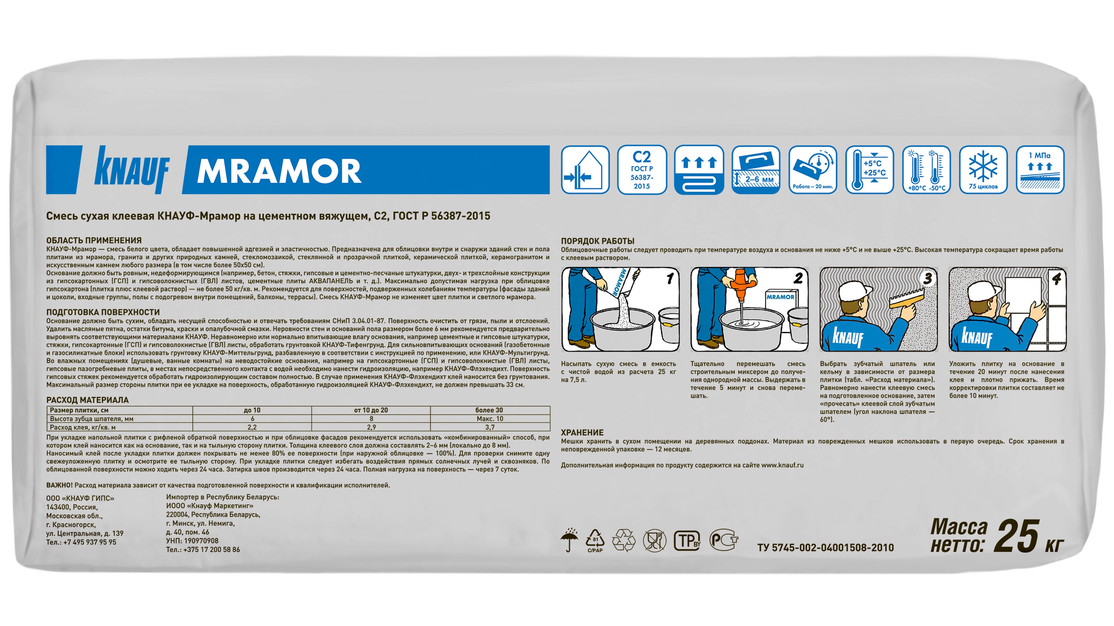 Клей КНАУФ Мрамор на белом цементе - применяется для укладки облицовочных плит из мрамора, природного камня и полупрозрачной (просвечивающейся) плитки, например стеклянной плитки или стекломозаики на обычные основания стен и пола (бетон, наливные полы, пористый и легкий бетон, цементно-волокнистые плиты, гипсовые пазогребневые КНАУФ-гипсоплиты, гипсоволокнистые КНАУФ-суперлисты и гипсокартонные КНАУФ-листы, известковые, известково-цементные, гипсовые штукатурки).