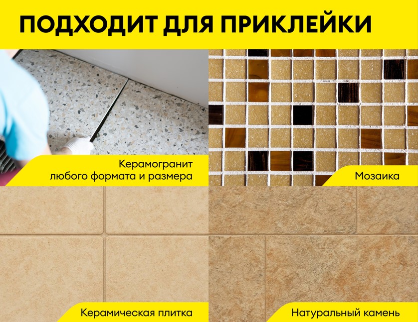 Высокая адгезия к гидроизоляционным материалам (кроме битумных). Подходит для облицовки фонтанов.