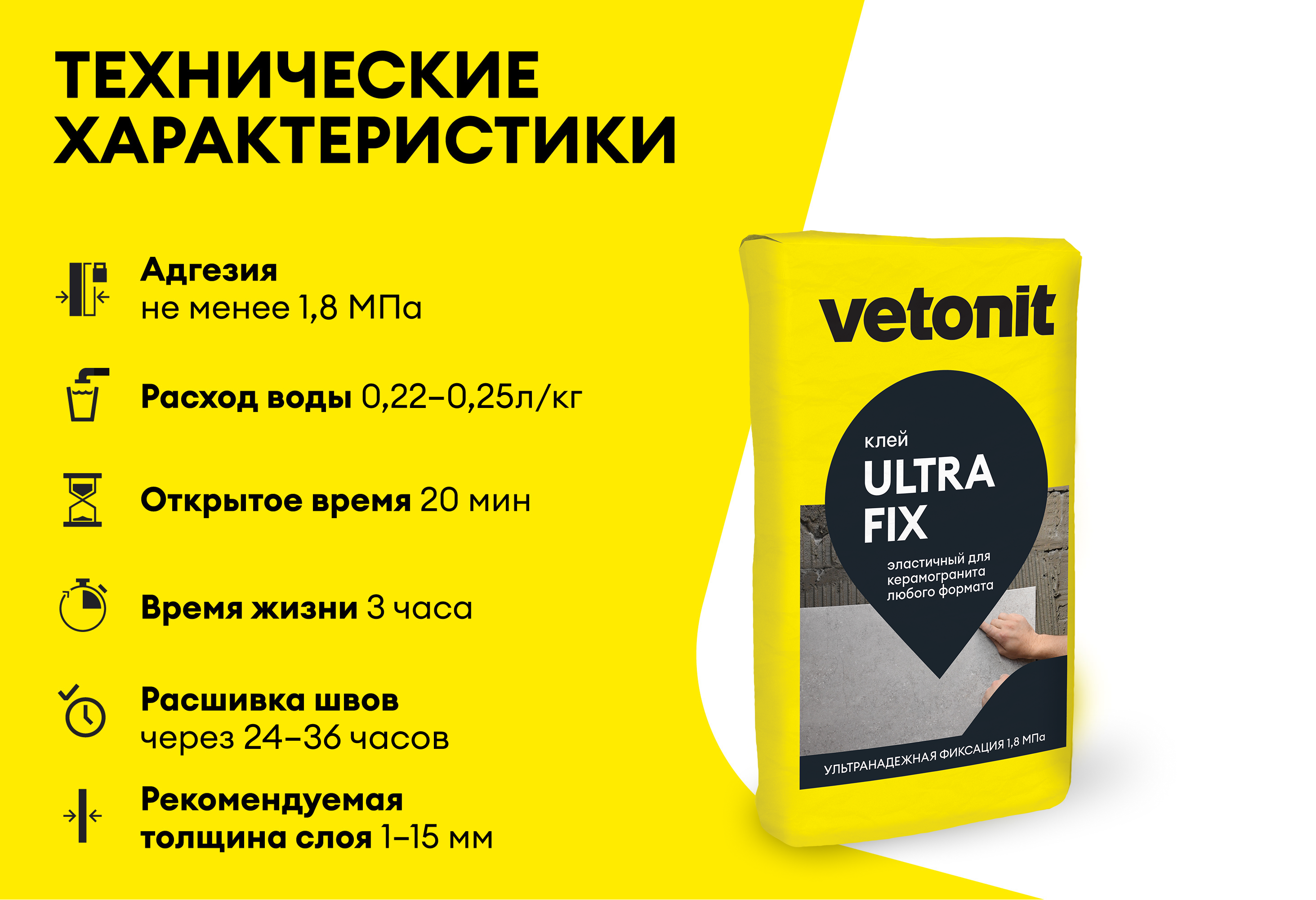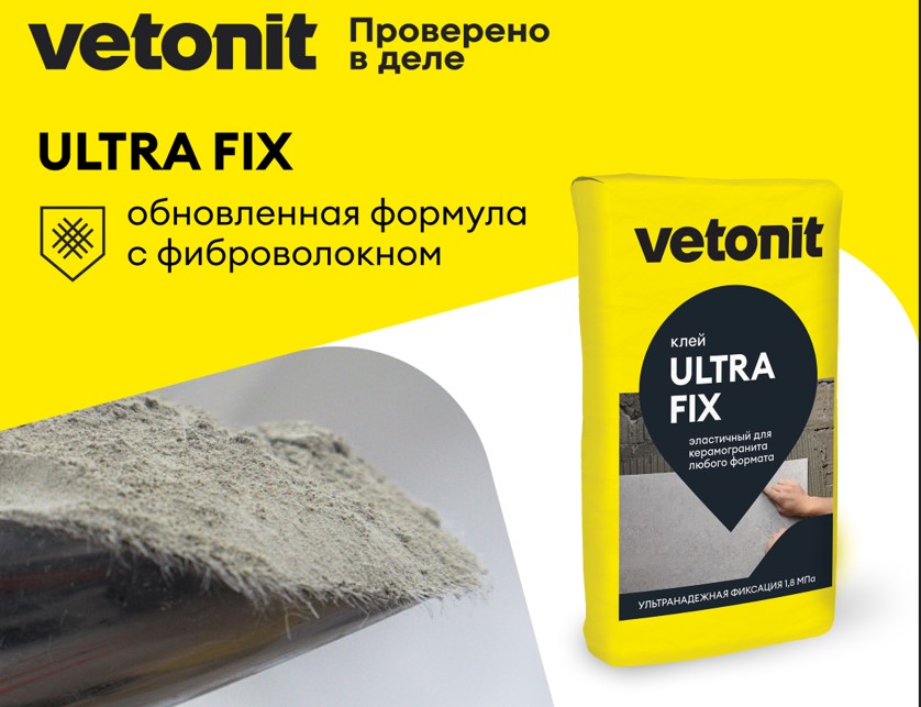 Клей Ветонит Ультра Фикс 25 кг - эластичный и высокодеформативный плиточный клей на цементной основе, предназначен для работы с керамической плиткой, мозаикой, керамогранитом, натуральным и искусственным камнем.