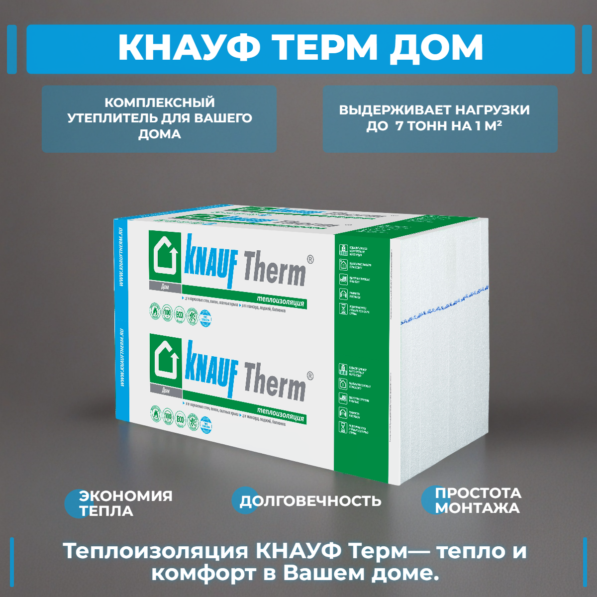 KNAUF Therm ДОМ (КНАУФ Терм ДОМ) — универсальный утеплитель из пенополистирола для теплоизоляции пола и стен в частном доме и на объектах, где важны удобный формат плит и стабильные теплозащитные свойства. Подходит для утепления в один или несколько слоев, а размер 600?1000 мм удобен в монтаже и транспортировке. KNAUF Therm Дом рассчитан на применение в постоянно эксплуатируемых помещениях и подходит для утепления стен по каркасной технологии; материал не боится влаги и выдерживает нагрузки до 7 тонн на 1 м 2 (в зависимости от конструкции и условий применения). Это делает пенопласт «Дом» практичным решением для утепления ненагруженных конструкций, а также полов и перекрытий при корректном устройстве слоев.