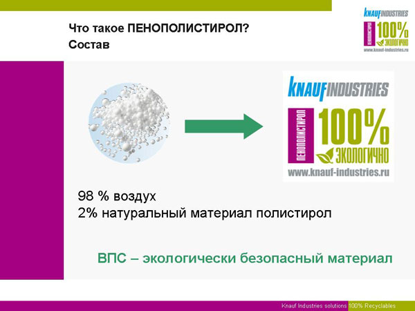 Пенополистирол КНАУФ Терм не подвержен гниению, химически нейтрален, экологически безопасен, что является значительным преимуществом пенополистирола Кнауф Терм перед другими теплоизоляционными материалами.