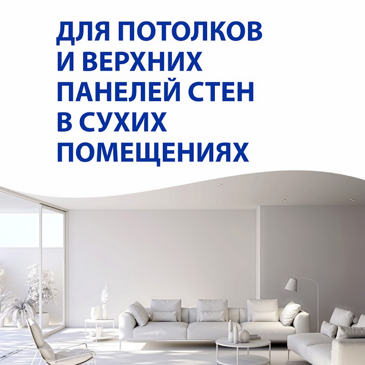 Глубокоматовая высокоукрывистая краска применяется для окраски потолков и верхних панелей стен в сухих помещениях. Для окраски новых или ранее оштукатуренных, окрашенных водно-дисперсионными красками, зашпатлёванных, оклеенных различными рулонными отделочными материалами поверхностей из бетона, газобетона, кирпича, асбоцемента, гипсокартонных плит, ДСП.