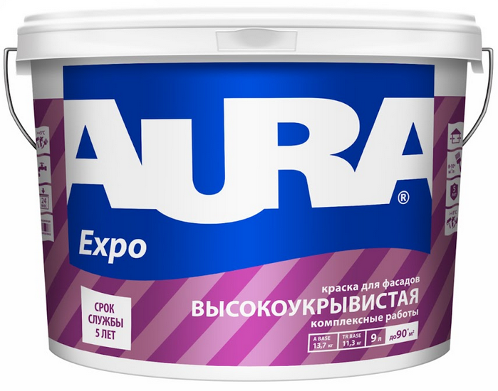 Матовая краска Краска Аура Expo– на водной основе используется для фасадов и помещений с повышенной влажностью.