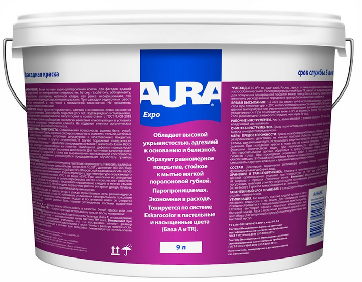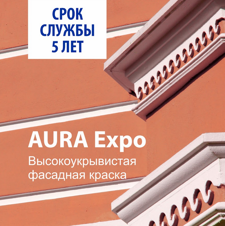 Краска Аура Expo – матовая водно-дисперсионная краска для фасадов и помещений с повышенной влажностью. Применяется для фасадных работ по бетону, газобетону, штукатурке, шпатлевке, кирпичной кладке, а также для отделочных работ внутри помещений с нормальной и повышенной влажностью. Может применяться для внутренних работ в помещениях промышленного назначения (производственные цеха, склады). Обладает высокой укрывистостью и адгезией к основанию. Образует качественное паропроницаемое атмосферостойкое покрытие.