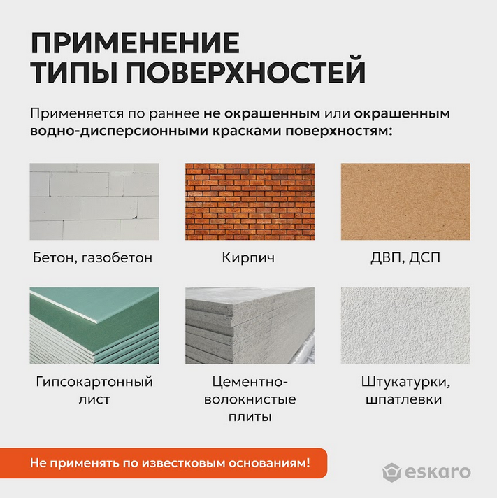 Типы поверхностей для нанесения: бетон, газобетон, цементно-волокнистые плиты, штукатурка, шпатлевка, кирпичная кладка, гипсокартон, двп