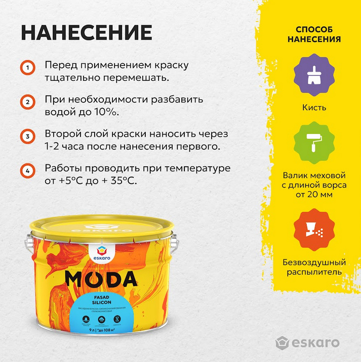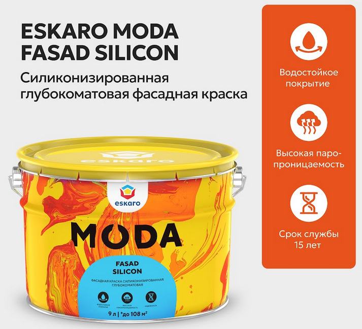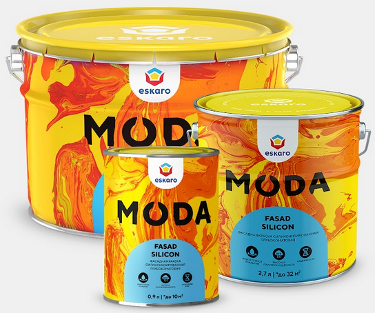 Eskaro Moda Fasad Silicon – фасадная силиконизированная краска. Предназначена для новых минеральных поверхностей, гипсокартона, ДВП, ДСП, а также для поверхностей, ранее окрашенных водно-дисперсионными красками. Подходит для окраски жилых, офисных, торговых и складских помещений. Не применять по известковым основаниям!