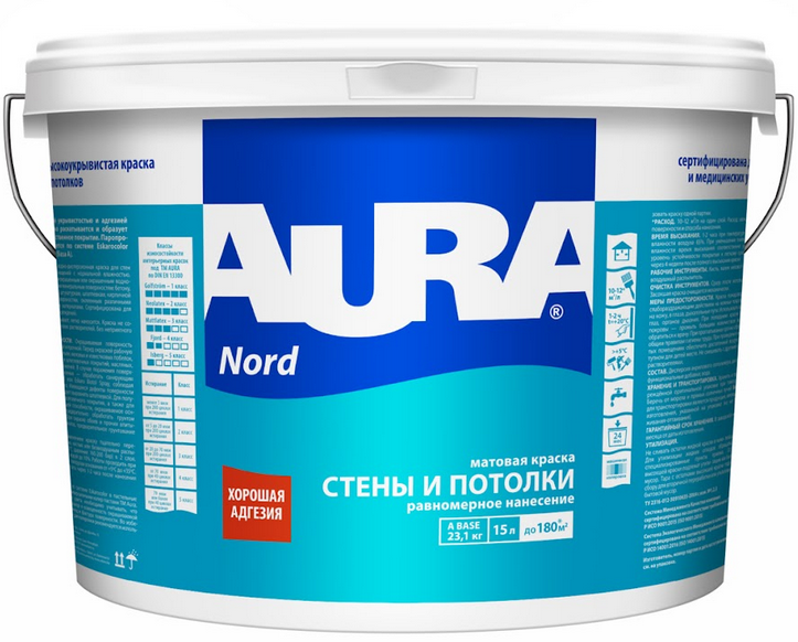Краска Аура Nord Применяется для окраски стен и потолков внутри помещений с нормальной влажностью. Для окраски новых или ранее оштукатуренных, окрашенных водно-дисперсионными красками, зашпатлёванных, оклеенных различными рулонными отделочными материалами поверхностей из бетона, газобетона, кирпича, асбоцемента, гипсокартонных плит, ДСП. Обладает отличной стойкость к сухому истиранию. Сертифицирована для детских и медицинских учреждений.