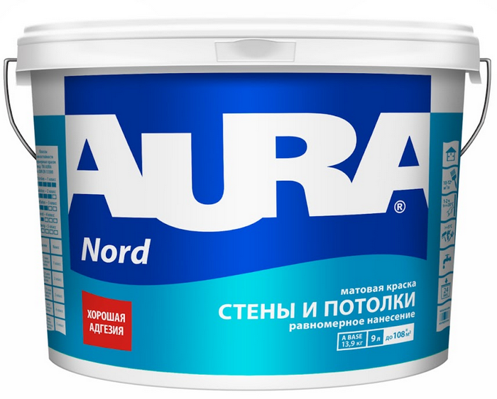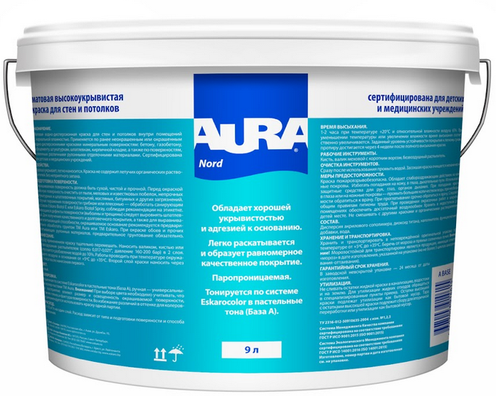 Краска Аура Nord Применяется для окраски стен и потолков внутри помещений с нормальной влажностью. Для окраски новых или ранее оштукатуренных, окрашенных водно-дисперсионными красками, зашпатлёванных, оклеенных различными рулонными отделочными материалами поверхностей из бетона, газобетона, кирпича, асбоцемента, гипсокартонных плит, ДСП. Обладает отличной стойкость к сухому истиранию. Сертифицирована для детских и медицинских учреждений.