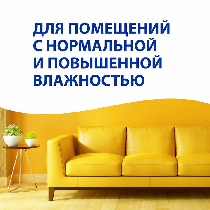 Матовая влагостойкая краска для стен и потолков внутри помещений с нормальной и повышенной влажностью, а также с возможными колебаниями влажности. Применяется по ранее неокрашенным или окрашенным водно- дисперсионными красками поверхностям: бетону, газобетону, асбоцементу, штукатуркам, шпатлевкам, кирпичной кладке, ДВП, ДСП, а также по поверхностям, оклеенным различными рулонными отделочными материалами. Сертифицирована для детских и медицинских учреждений. Белый – можно использовать без колеровки