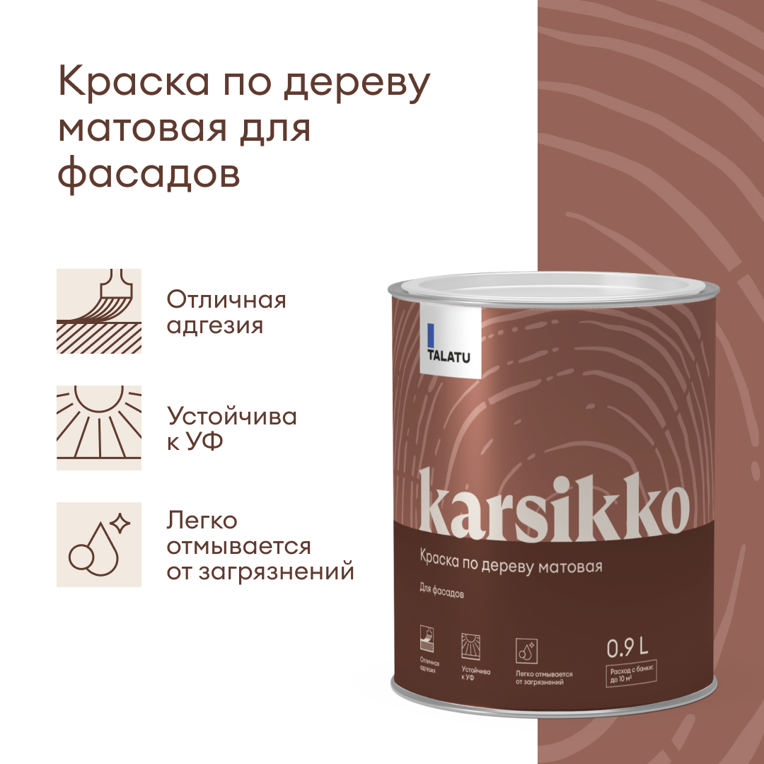 Водно-дисперсионная полиакриловая матовая краска для деревянных фасадов Talatu KARSIKKO предназначена для окрашивания фасадов из всех видов обшивочных досок, вагонки, имитации бруса, блок-хауса, планкена.