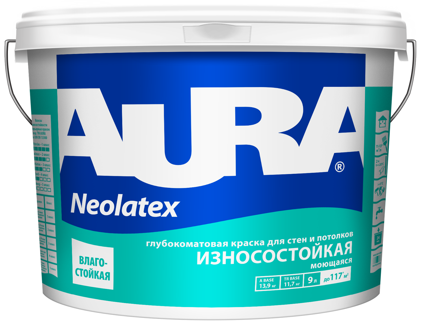 Краска износостойкая для стен и потолков Aura Neolatex - водно-дисперсионная матовая для помещений с повышенной влажностью. Подходит для поверхностей, требующих регулярного мытья (стены в административных и офисных помещениях и пр.),