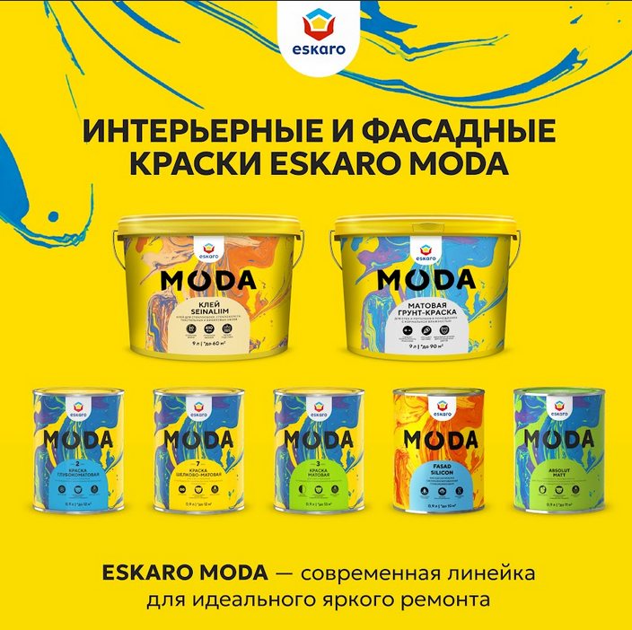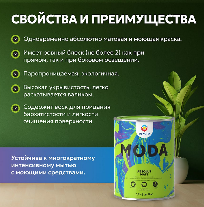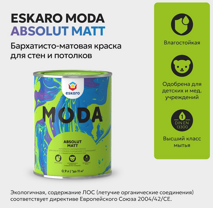 Moda Absolut Matt — это износостойкая абсолютно матовая акрилатная краска на водной основе, созданная для финишной отделки стен и потолков при внутренних работах. Она идеально подходит для помещений с нормальной и повышенной влажностью, сочетая эстетику с высочайшей практичностью.