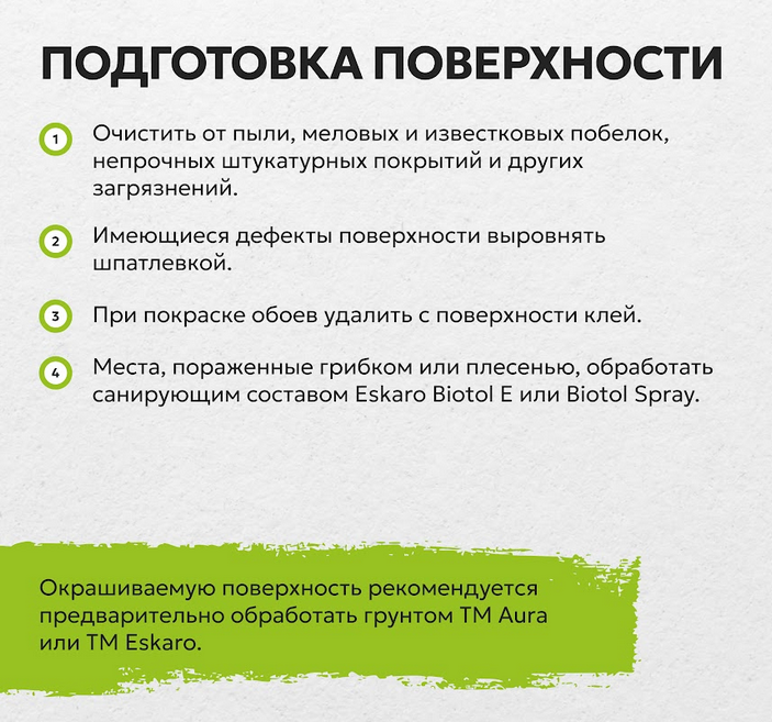 Окрашиваемая поверхность должна быть сухой, чистой и прочной. Перед окраской рабочую поверхность очистить от пыли, меловых и известковых побелок, непрочных штукатурных и шпатлевочных покрытий, масляных, битумных и других загрязнений.