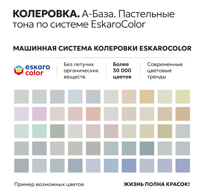 Колеровка машинная по системе Eskarocolor в пастельные (база А) и насыщенные тона (база TR), ручная – универсальными колер пастами