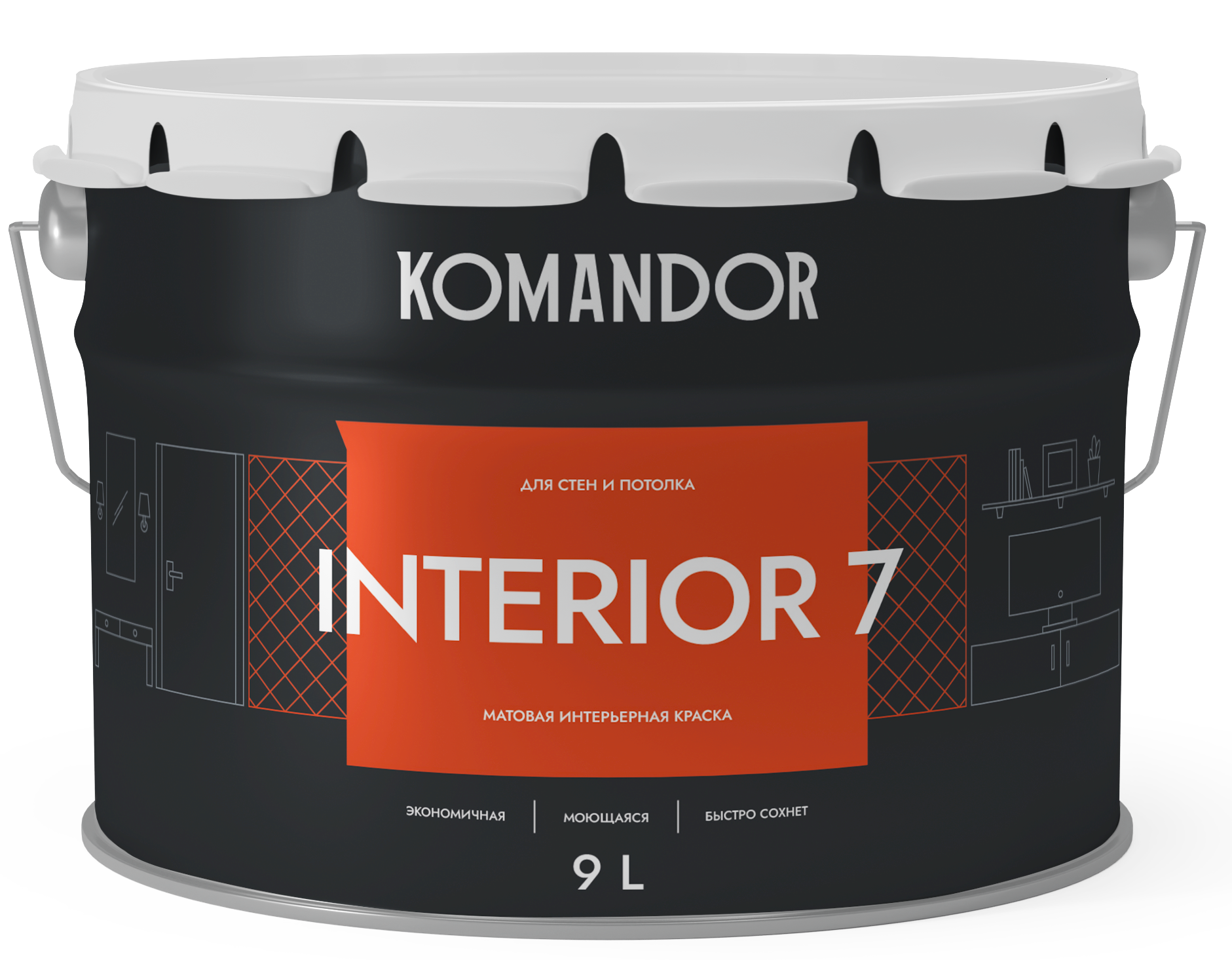 Матовая интерьерная водно-дисперсионная полиакриловая краска для стен и потолка Komandor Interior 7 применяется для помещений с высокой эксплуатационной нагрузкой. Разработана специально для окрашивания стен и потолков в помещениях с периодически повышенной влажностью: кухнях, коридорах.