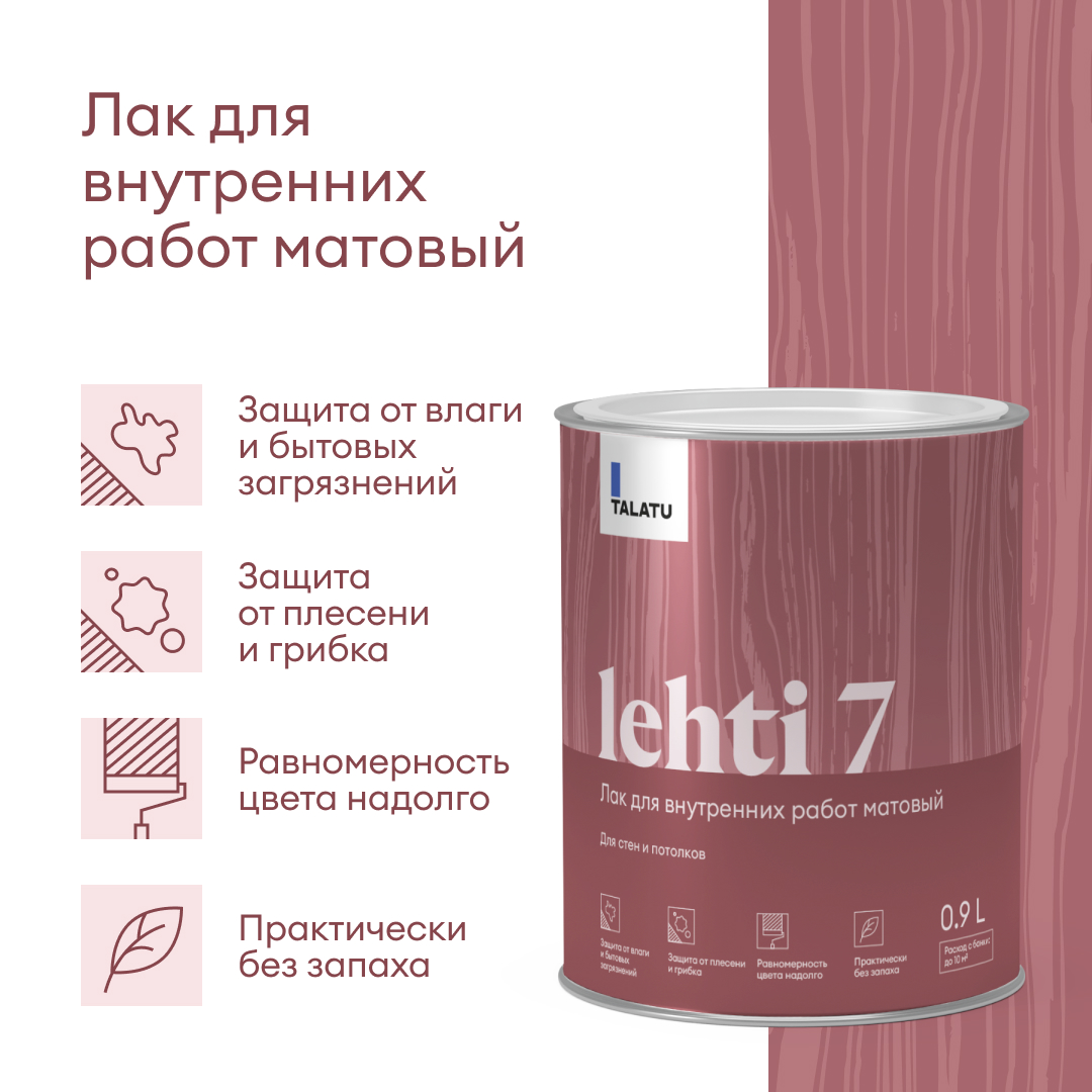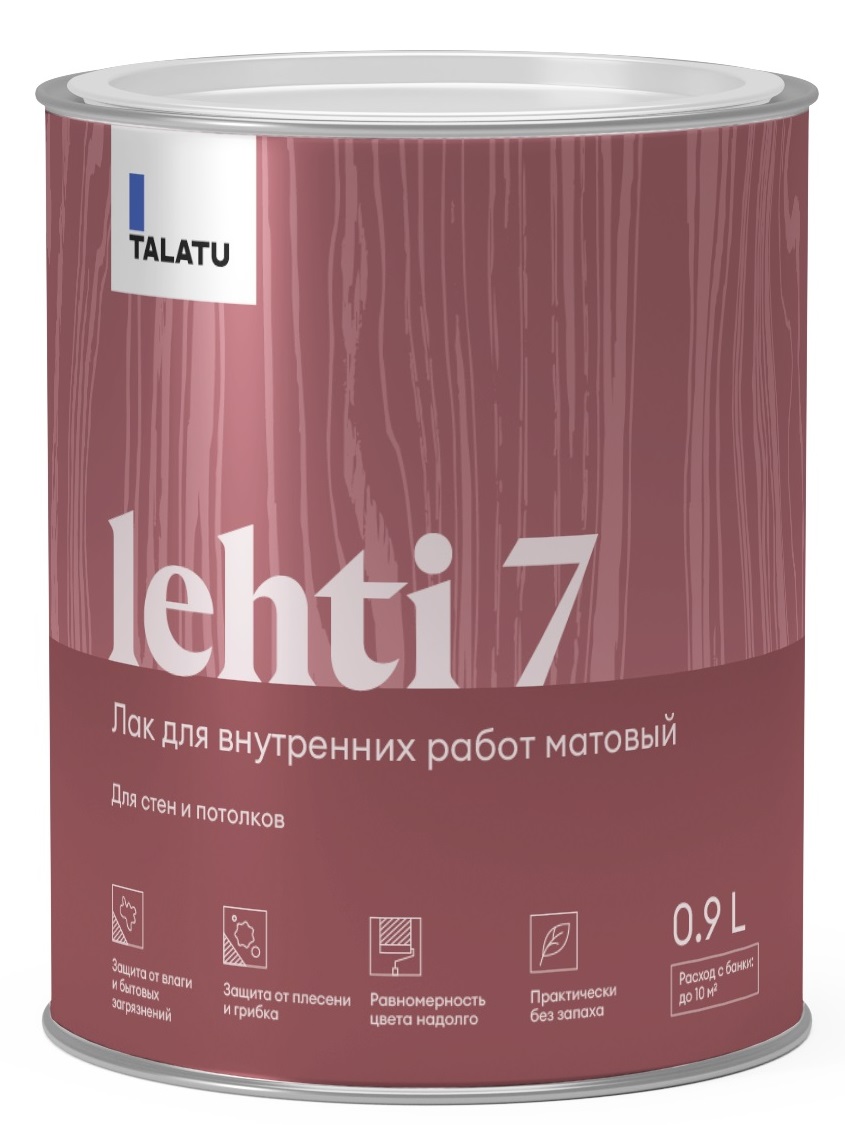 Водно-дисперсионный полиакриловый матовый лак с добавлением воска для стен и потолков Talatu LEHTI 7 применяется для деревянных панелей, вагонки, досок, OSB и ДСП плит, столярных, художественных изделий, а также бетонных и кирпичных поверхностей, декоративного искусственного камня в местах с нормальной влажностью.