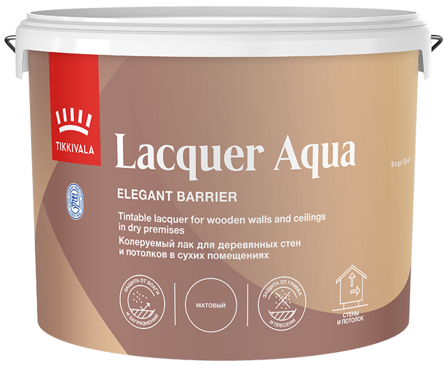 Лак интерьерный Tikkurila Lacquer Aqua матовый EP 9л - колеруемый лак на акрилатной основе для внутренних работ. Подходит для деревянных панелей, вагонки, доскок, брёвен, а также бетонных и кирпичных поверхностей.