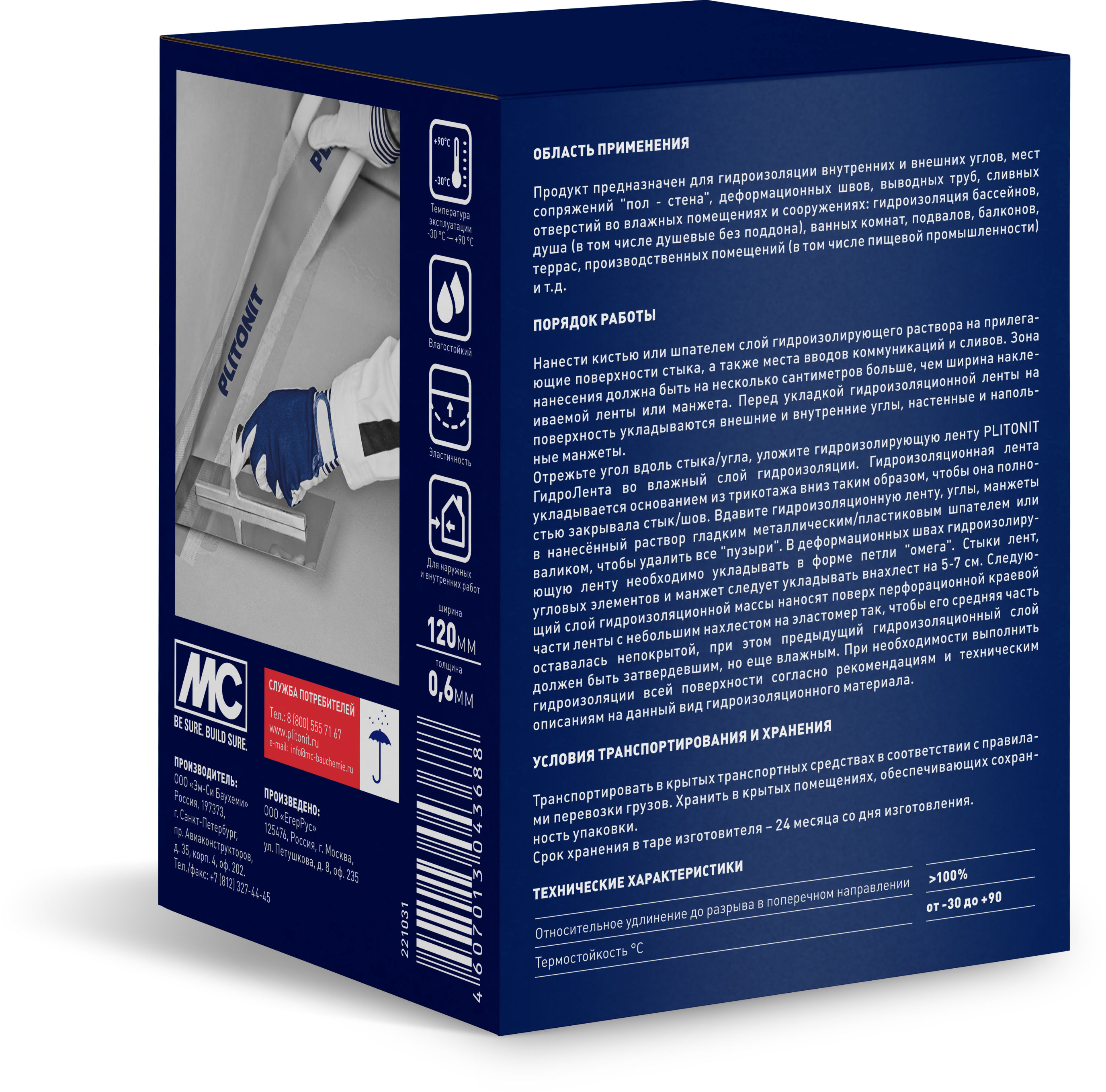 Область применения Гидроизоляционная лента Плитонит ГидроЛента 10 м применяется для: Преимущества гидроизоляционной ленты: Инструкция по применению: Нанесите кистью или шпателем слой гидроизоляционной мастики на поверхность шва или стыка. Уложите внутренние/внешние углы и манжеты. Вдавите ленту PLITONIT ГидроЛента в свежий слой гидроизоляции трикотажной стороной вниз. Уберите воздушные пузыри шпателем или валиком. В деформационных швах лента укладывается в форме петли «омега». Стыки лент и элементов выполняйте с нахлестом 5–7 см. Нанесите следующий слой гидроизоляционной массы поверх краевой части ленты. Советы и совместимость: Используйте PLITONIT ГидроЛента совместно с гидроизоляционной мастикой PLITONIT ГидроЭласт. Для объектов с повышенным давлением воды (бассейны, подвалы, резервуары) рекомендуется PLITONIT ГидроЭласт 2К.