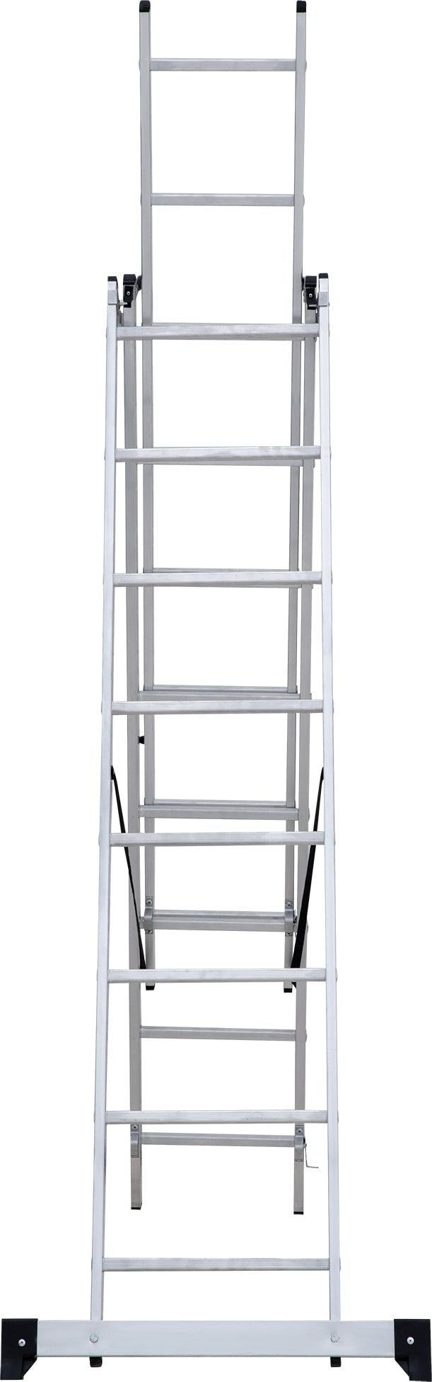 Лестница трехсекционная – это универсальная лестница, которая может использоваться в разных режимах: как приставная, раздвижная, двухсторонняя стремянка, стремянка с выдвижной секцией и лестничный марш.