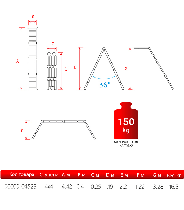 Удобная лестница-трансформер для использования в быту и профессиональных целях. Лестницу можно применять в качестве стремянки, приставной конструкции, помоста и приставной согнутой лестницы. Легко складывается для хранения и транспортировки, занимает мало места в сложенном состоянии.