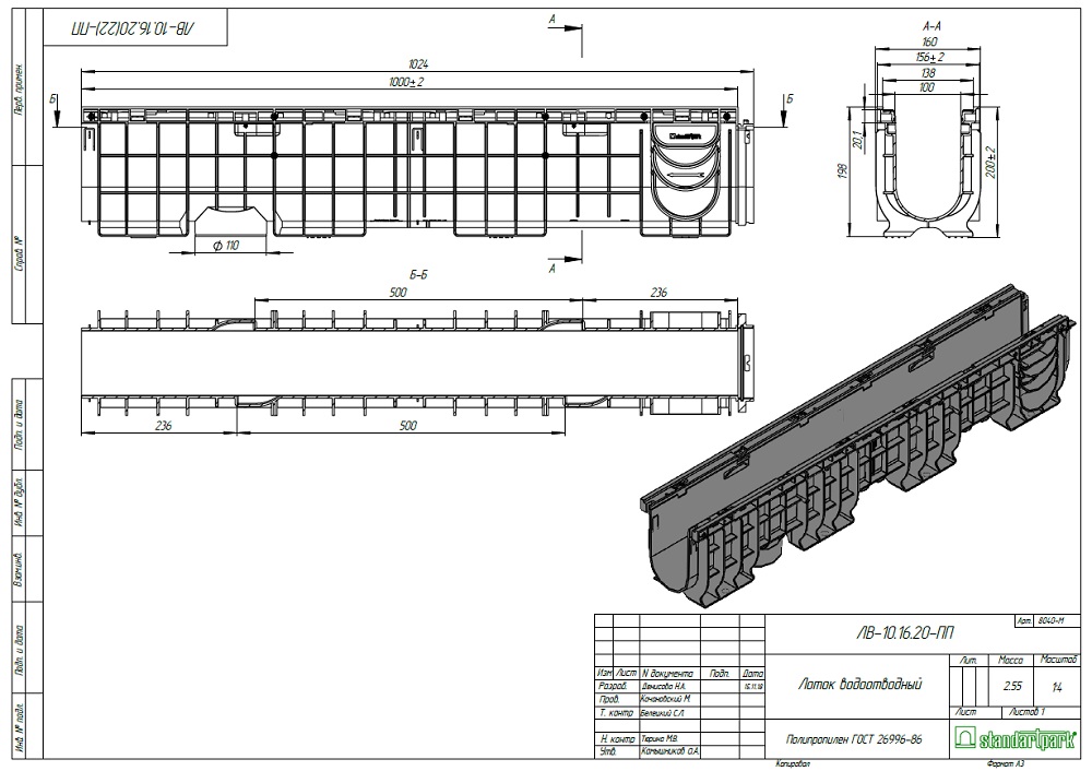 Лоток водоотводный пластиковый 1000 х 160 х 120 мм