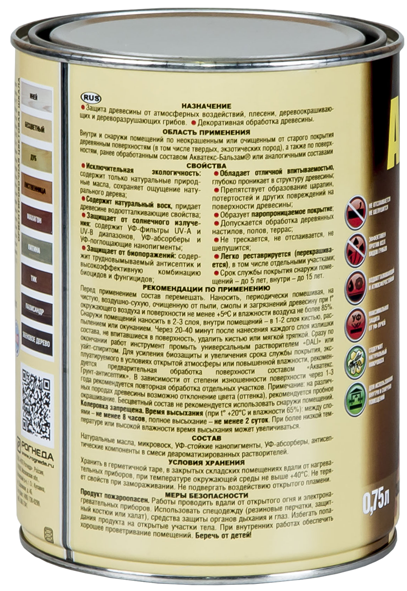 Состав: натуральные масла, микровоск, УФ-стойкие нанопигменты, УФ-абсорберы, антисептические компоненты в смеси деароматизированных растворителей