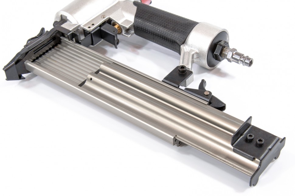 Пневматический гвоздезабивной пистолет (нейлер) предназначен для работ по монтажу каркасов, плинтусов, обшивки, утеплителя и напольных покрытий. Можно работать с паркетной доской, фанерой, гипсокартонном, кожей и т.д. Совместим с гвоздями 18GA длиной от 10 до 50 мм. Долговечный и удобный инструмент. Магазин вмещает 100 гвоздей и быстро перезаряжается. В комплект к данному инструменту идут: