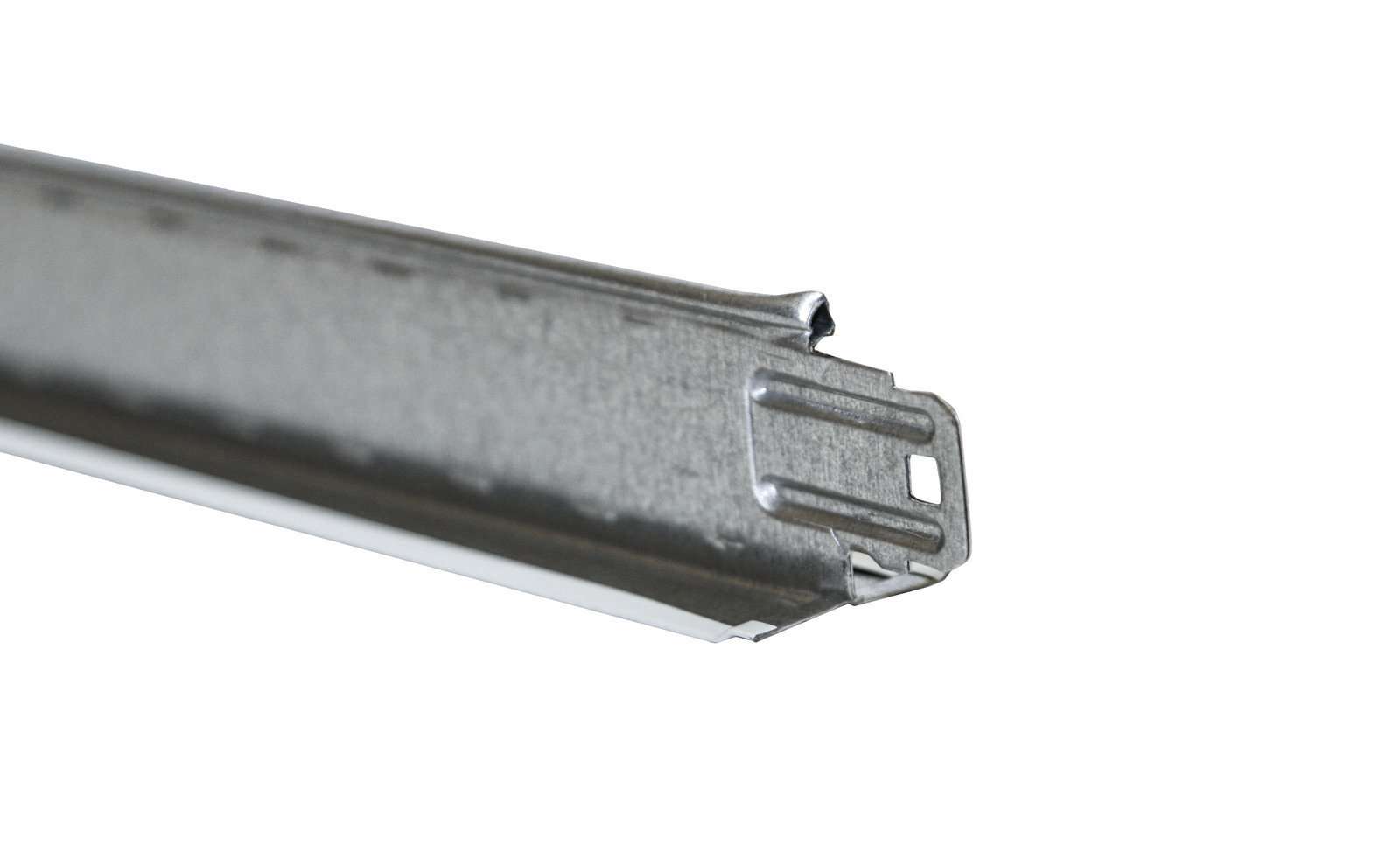 - Монтаж основных несущих направляющих длиной 3600мм. Профили 3,6 закрепляются на предварительно смонтированные подвесы. Шаг между основными направляющими составляет 1200мм. По длине несущие направляющие соединяются между собой замками на торцах направляющих.