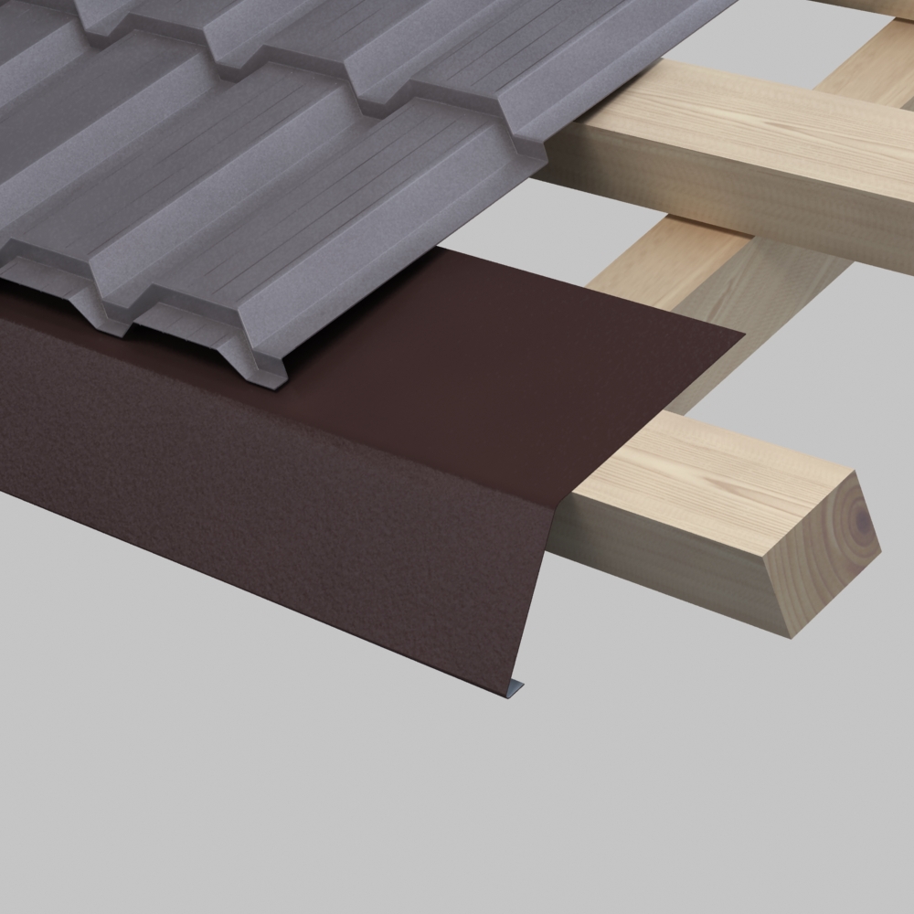 Карнизная планка для металлочерепицы - это кровельный доборный элемент, предназначенный для защиты карнизной (лобовой) доски и основания стропильной конструкции от попадания воды, а также направляет потоки в водосточный желоб и выполняет декоративную функцию