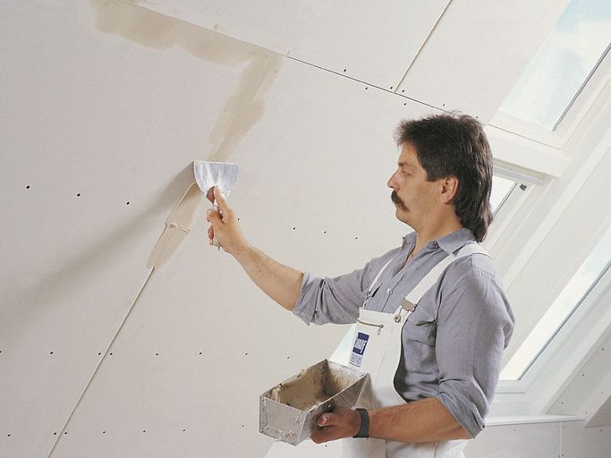 - Для наружных слоев обшивки необходимо нанесение второго слоя шпаклёвки для обеспечения плавного перехода между стыком и плоскостью плит. Для этого применяется шпаклевка КНАУФ-Унихард, которая наносится широким шпателем. Торцевые стыки наружного слоя шпаклюются с применением бумажной армирующей ленты.