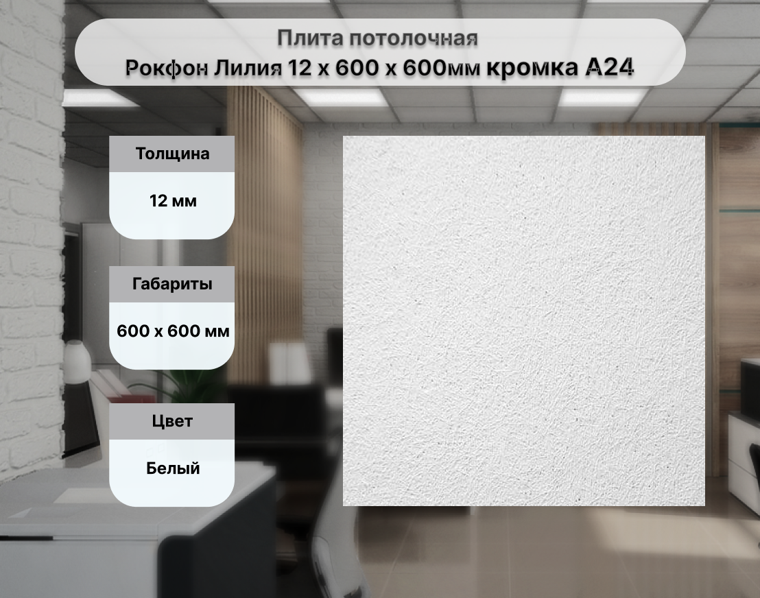 Rockfon Lilia - это плита с гладкой поверхностью белого цвета,без использования стеклоткани на задней поверхности панели.