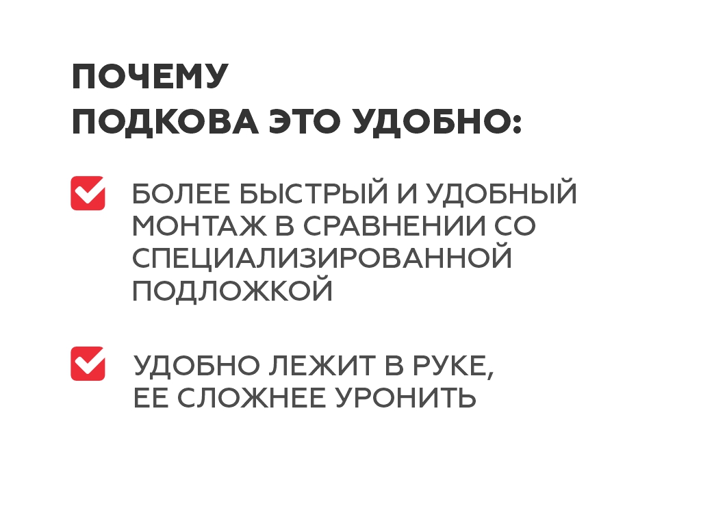 Преимущества и выгоды применения : Порядок работы Перед применением изделие необходимо выдержать при комнатной температуре не менее 30 минут. На одну грань плитки необходимо использовать не менее двух подков. Удалять подковы необходимо только после затвердевания клея. Допускается многоразовое использование подков. Состав: пластик Условия хранения: Хранить в сухом месте, защищенном от прямых солнечных лучей, при комнатной температуре. Рекомендуемый срок хранения- не ограничен (при соблюдении условий хранения).